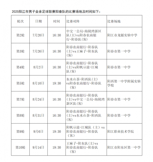 信息拓展:“体育助力百县千镇万村高质量发展工程——2025阳江市男子业余足球联赛”阳春队赛程公布,阳春球迷快来看看吧!安排好时间为阳春队加油助威。