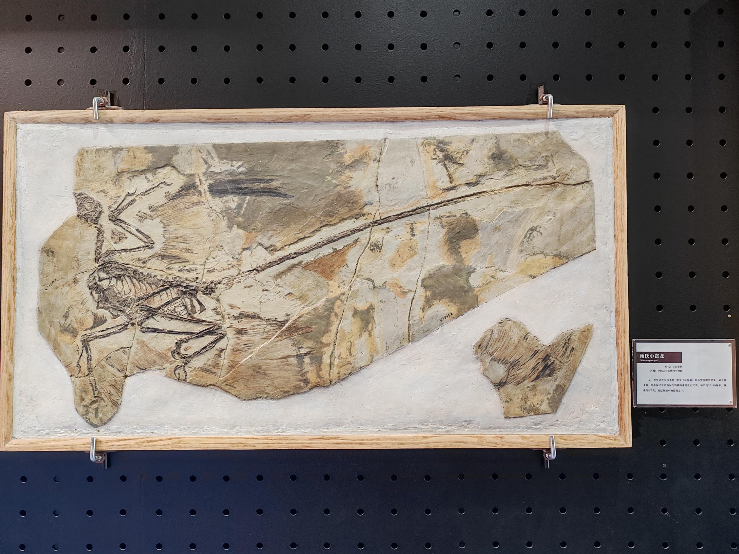 与巨无霸马门溪龙形成鲜明对比,顾氏小盗龙的体型娇小。令人惊叹的是,站在它的化石前,能清晰看到它长着两对翅膀。