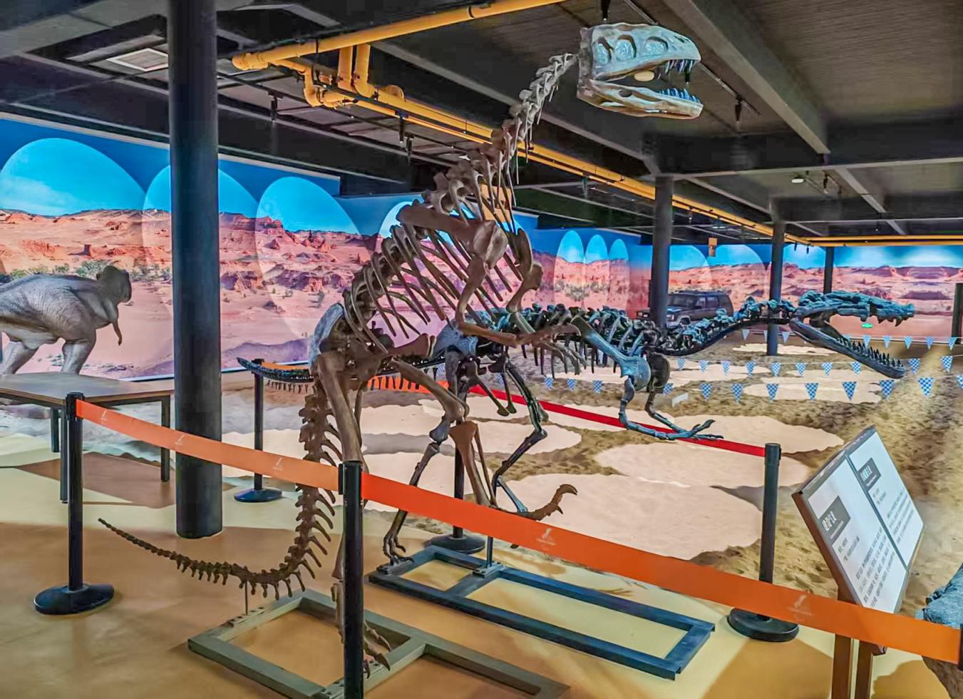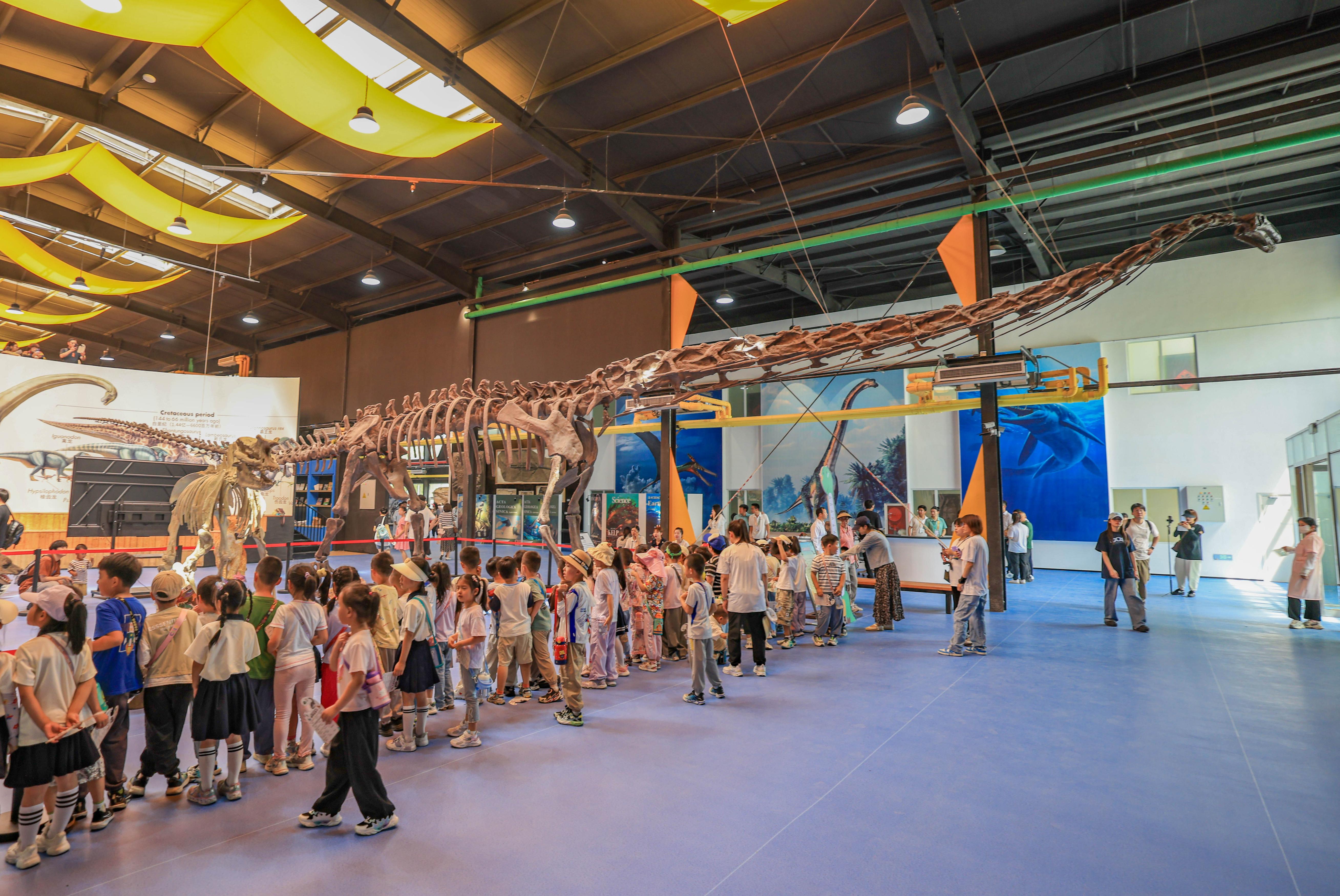 基地一层挑空大厅,一具长达24米的“长颈巨无霸”凌空而立,长长的脖颈伸向半空,扑面而来的震撼让人屏息。这架恐龙正是合川马门溪龙——中国发现的最著名的蜥脚类恐龙之一,也是世界范围内享有盛誉的巨型恐龙化石。