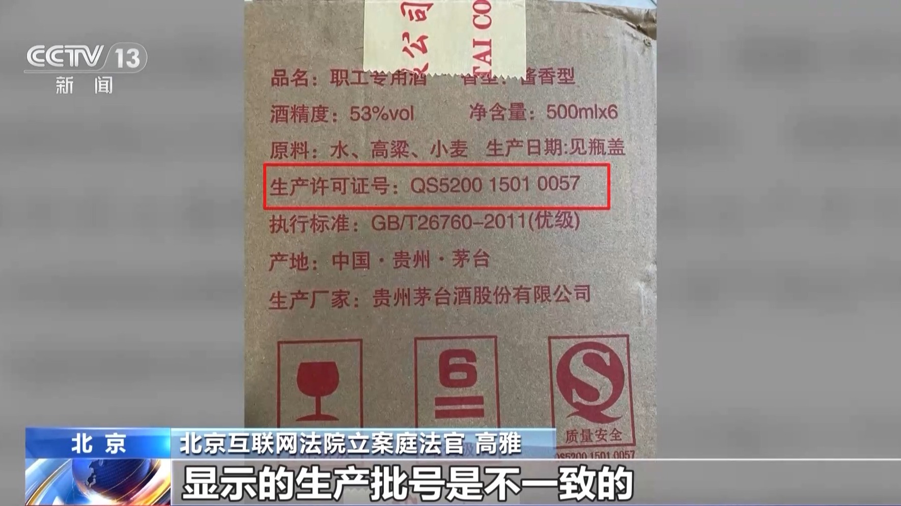 北京互联网法院立案庭法官 高雅:原告向法院提供了一份市场监管局的回复,显示酒厂品牌的生产批号,和原告所购买到的商品的外包装上显示的生产批号是不一致的。根据这些证据,我们可以看到原告所购买到的商品确实是假冒商品,不仅伪造了生产商、品牌,也伪造了生产许可证。
