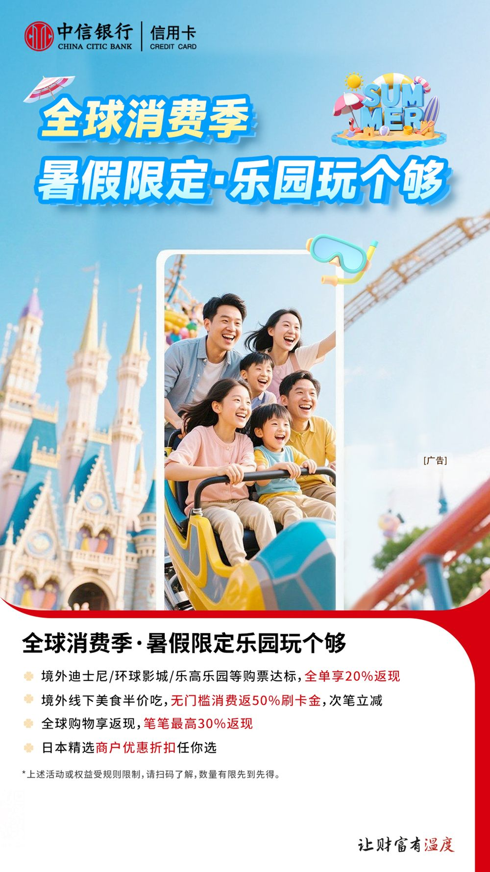 据世界旅游组织最新报告,中国是世界上最大的旅游支出国,我国居民在2024年出境支出增长达30%。当前,恰逢暑期境外出游消费高峰期,中信银行信用卡进一步为“全球消费季”主题活动加码,推出“暑假限定·乐园玩个够”等系列优惠活动,覆盖出境游客游玩、餐饮、购物等不同消费场景,为持卡人提供高性价比的消费体验,充分发挥金融服务在促进出境游消费中的积极作用。
