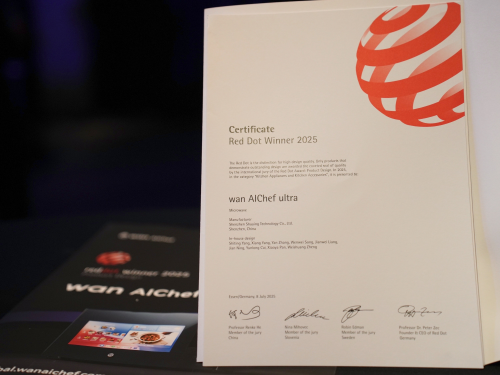 2025年7月8日,全球工业设计领域最具权威的奖项之一——红点设计大奖(Red Dot Design Award)在德国埃森举行盛大的颁奖典礼。万得厨凭借其革命性产品“万得厨烹饪智能体wan AIChef ultra”,成功斩获2025年红点产品设计奖,标志其在智能产品领域的创新实力获得国际认可。作为为数不多的受邀品牌之一,万得厨在颁奖典礼现场向全球设计界展示了AI驱动下的未来厨房解决方案。